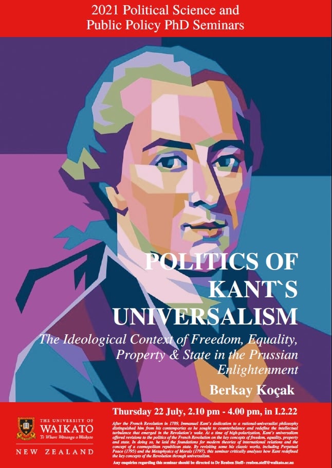 Koçak, B. (2021b). Politics of Kant’s Universalism: The Ideological Context of Freedom, Equality, Property & State in the Prussian Enlightenment. Paper presented at 2021 Political Science and Public Policy PhD Seminars, Hamilton, New Zealand. View Abstract