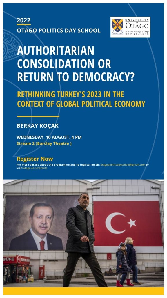 Koçak, B. (2022). Authoritarian Consolidation or Return to Democracy? Rethinking Turkey’s 2023 in the Context of Global Political Economy. Paper presented at 2022 New Zealand Political Studies Association Conference, University of Waikato, Waikato, New Zealand. View Abstract