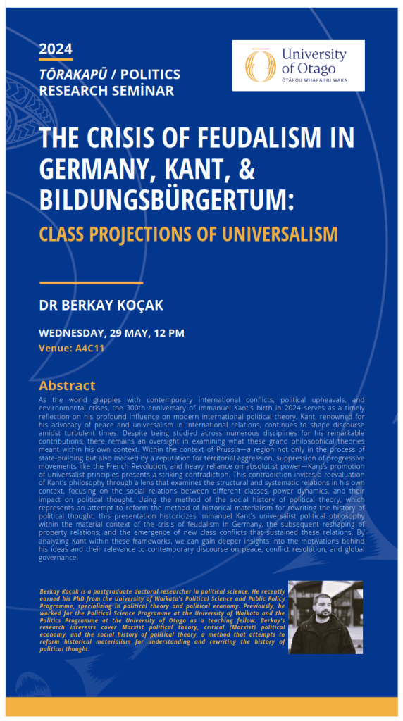 Koçak, B. (2024, May 29). The Crisis of Feudalism in Germany, Kant & Bildungsbürgertum: Class Projections of Universalism. Presented at 2024 Politics Programme Research Seminars, Dunedin, Otago New Zealand.