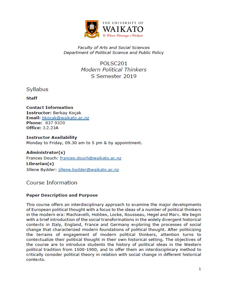 This course offers an interdisciplinary approach to examine the major developments of European political thought with a focus to the ideas of a number of political thinkers in the modern era: Machiavelli, Hobbes, Locke, Rousseau, Hegel and Marx. We begin with a brief introduction of the social transformations in the widely divergent historical contexts in Italy, England, France and Germany exploring the processes of social change that characterized modern foundations of political thought. After politicizing the terrains of engagement of modern political thinkers, attention turns to contextualize their political thought in their own historical setting. The objectives of the course are to introduce students the history of political ideas in the Western political tradition from 1500-1900, and to offer them an interdisciplinary method to critically consider political theory in relation with social change in different historical contexts.